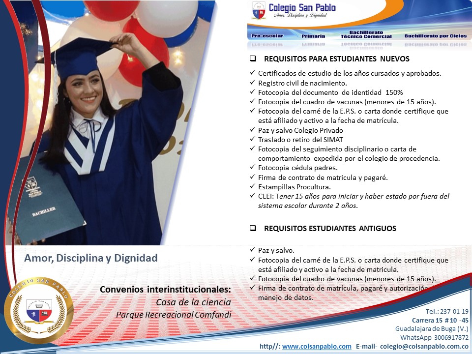 ¿Interesado en conocer más sobre nuestra oferta educativa? En Colegio San Pablo, estamos comprometidos con brindar una educación integral desde preescolar hasta media técnica comercial. Te invitamos a contactarnos para obtener más información o para programar una visita a nuestras instalaciones. ¡Descubre cómo podemos ser parte del futuro educativo de tu hijo!
